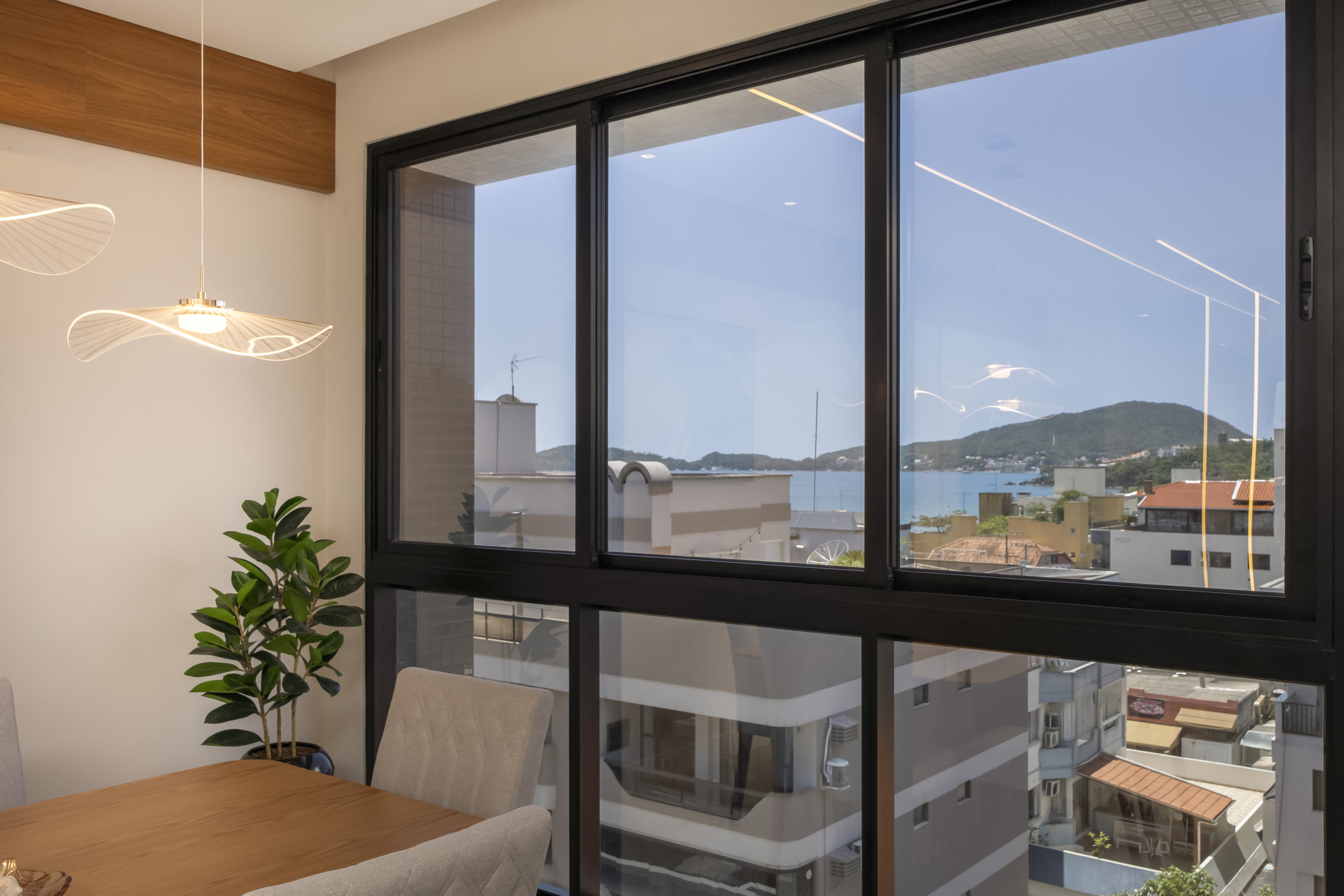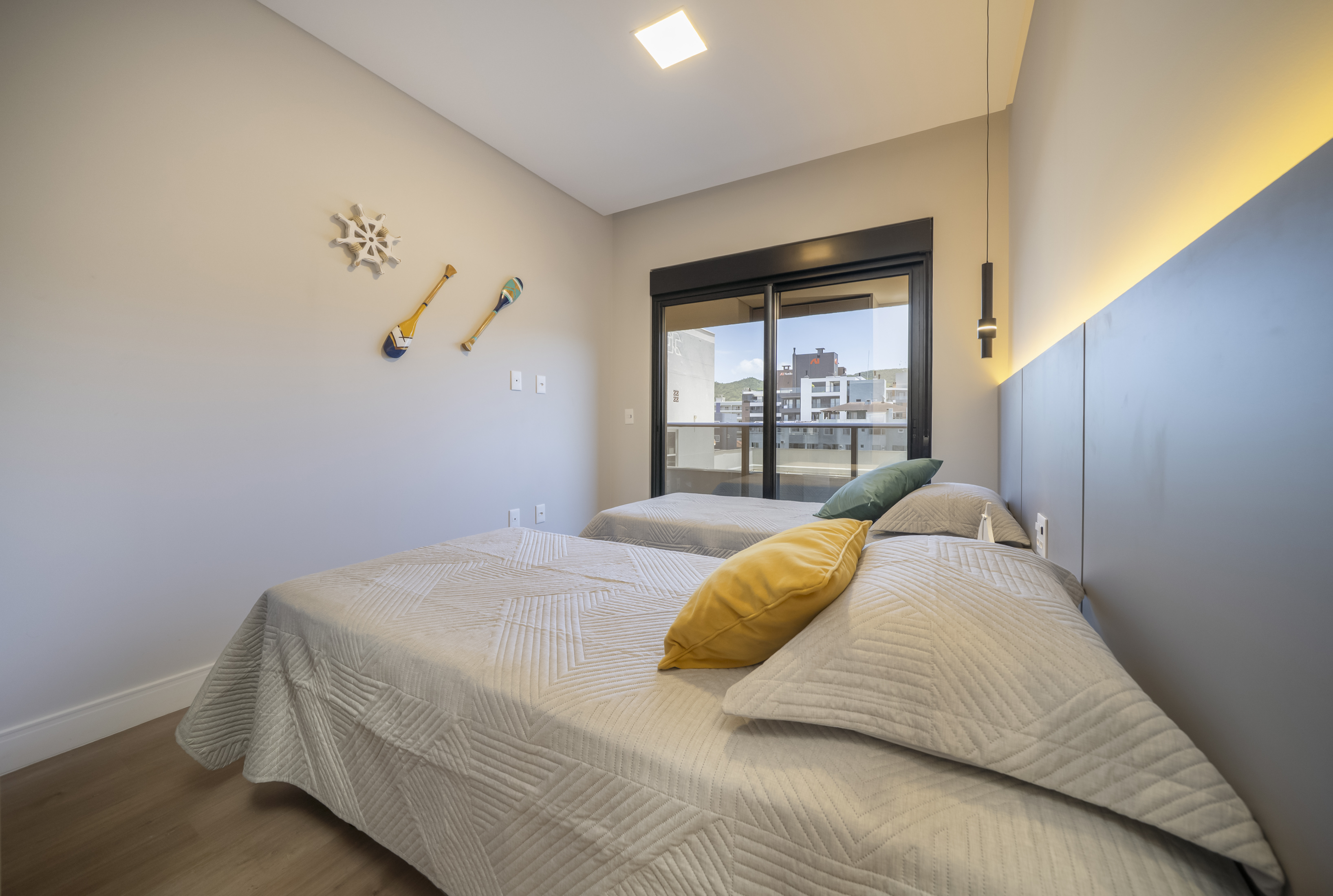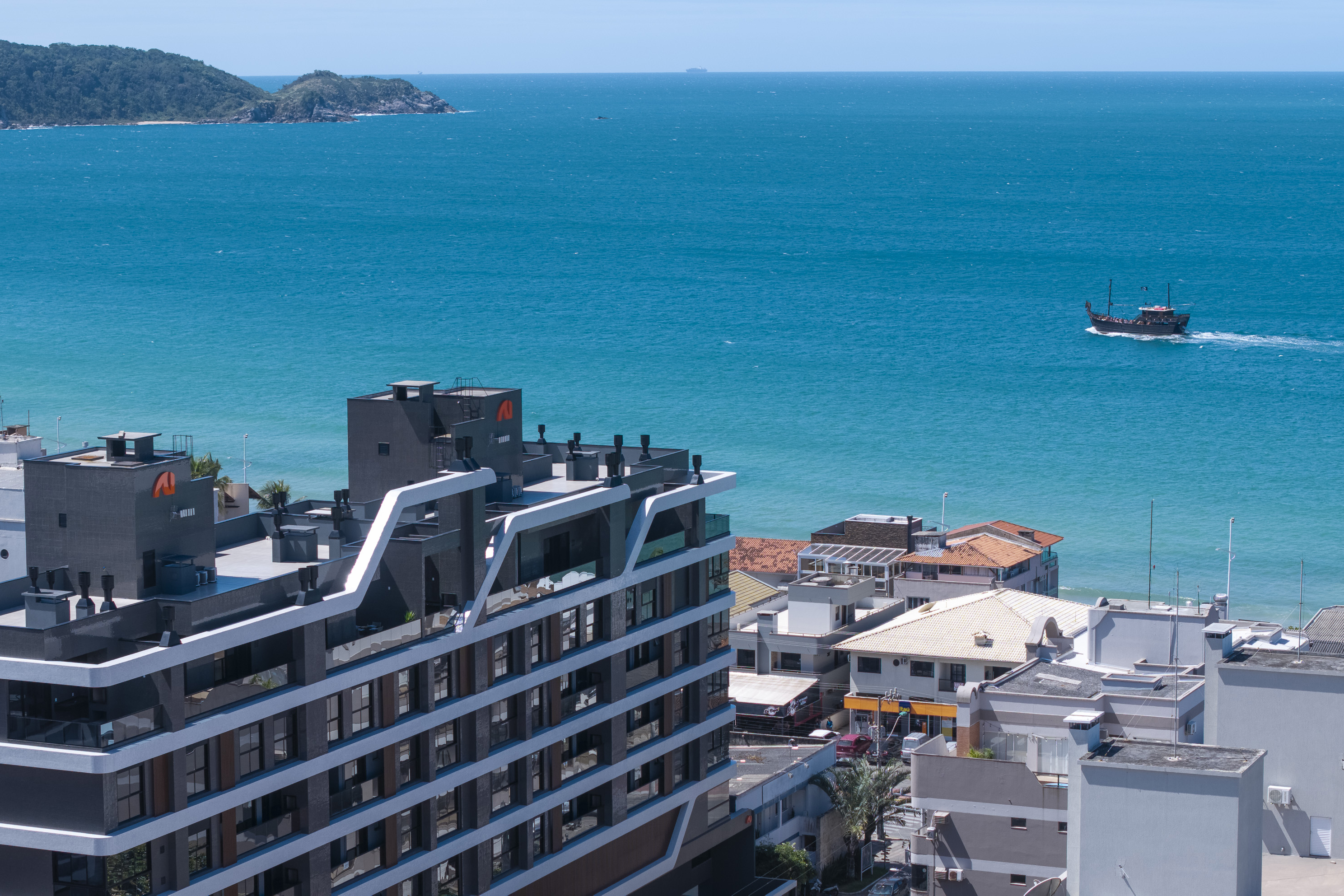 Descrição: Apartamento de três suÃtes no 5° piso em condomÃnio com piscina a 70 metros da praia de Bombas. |