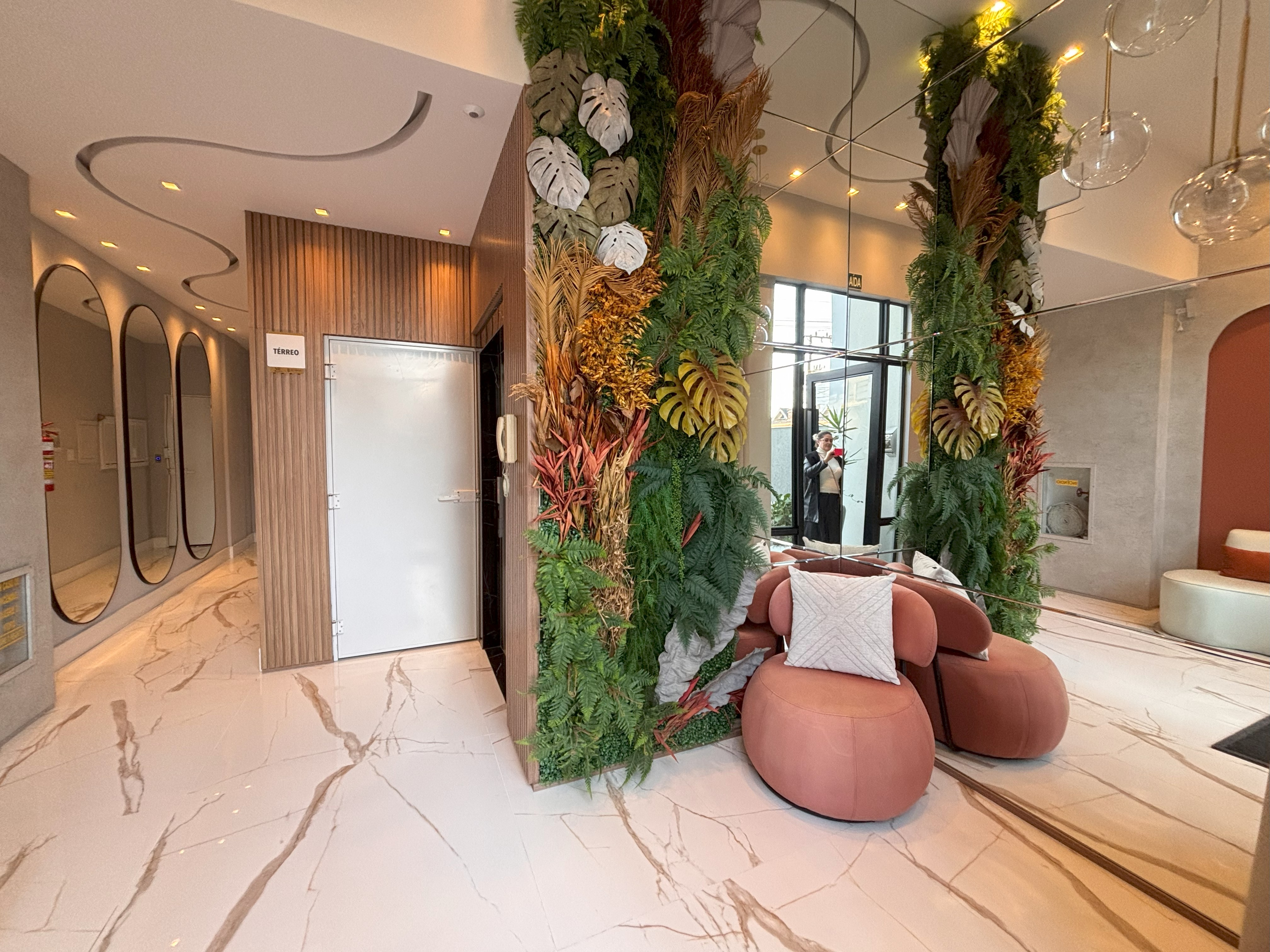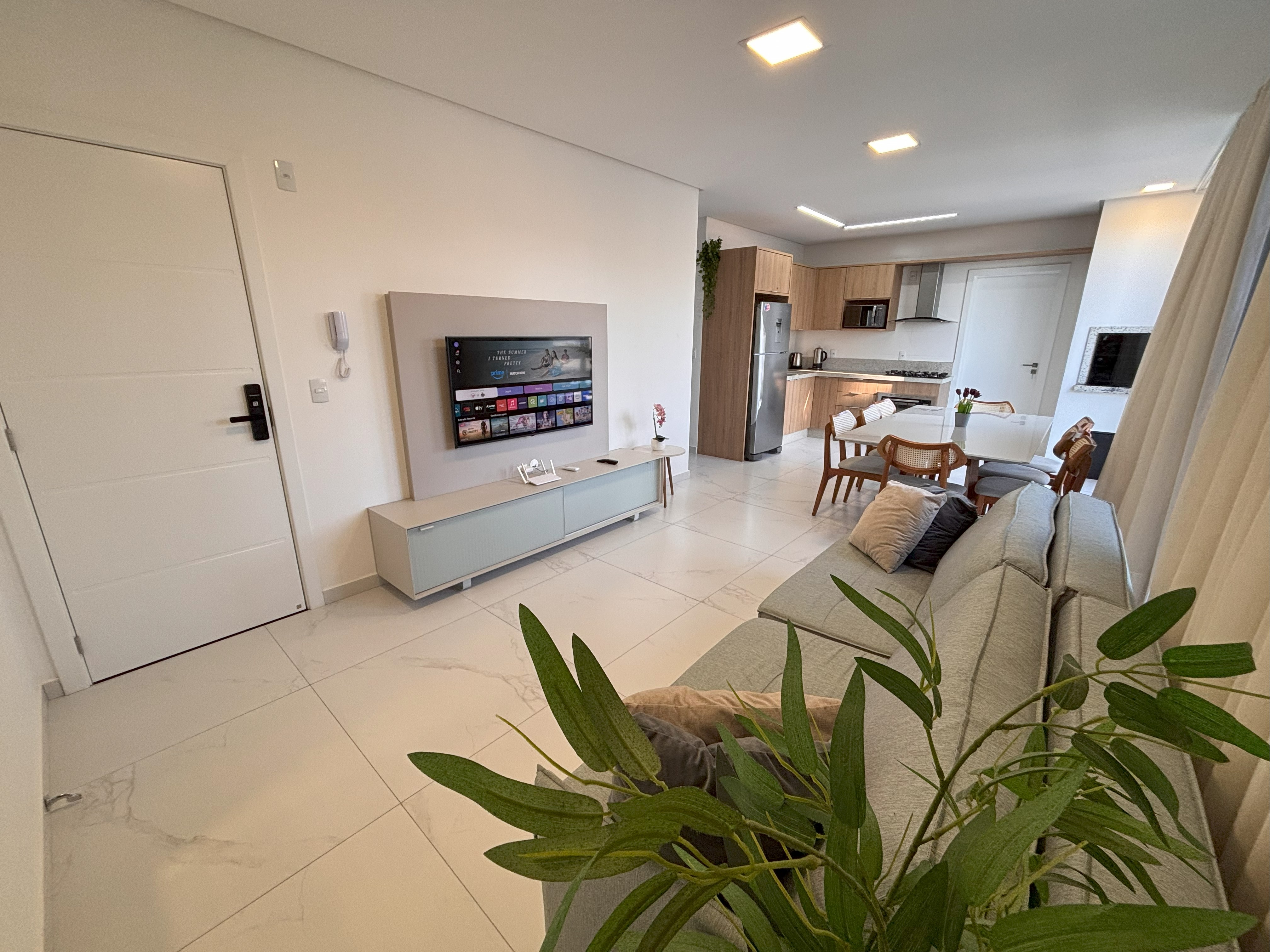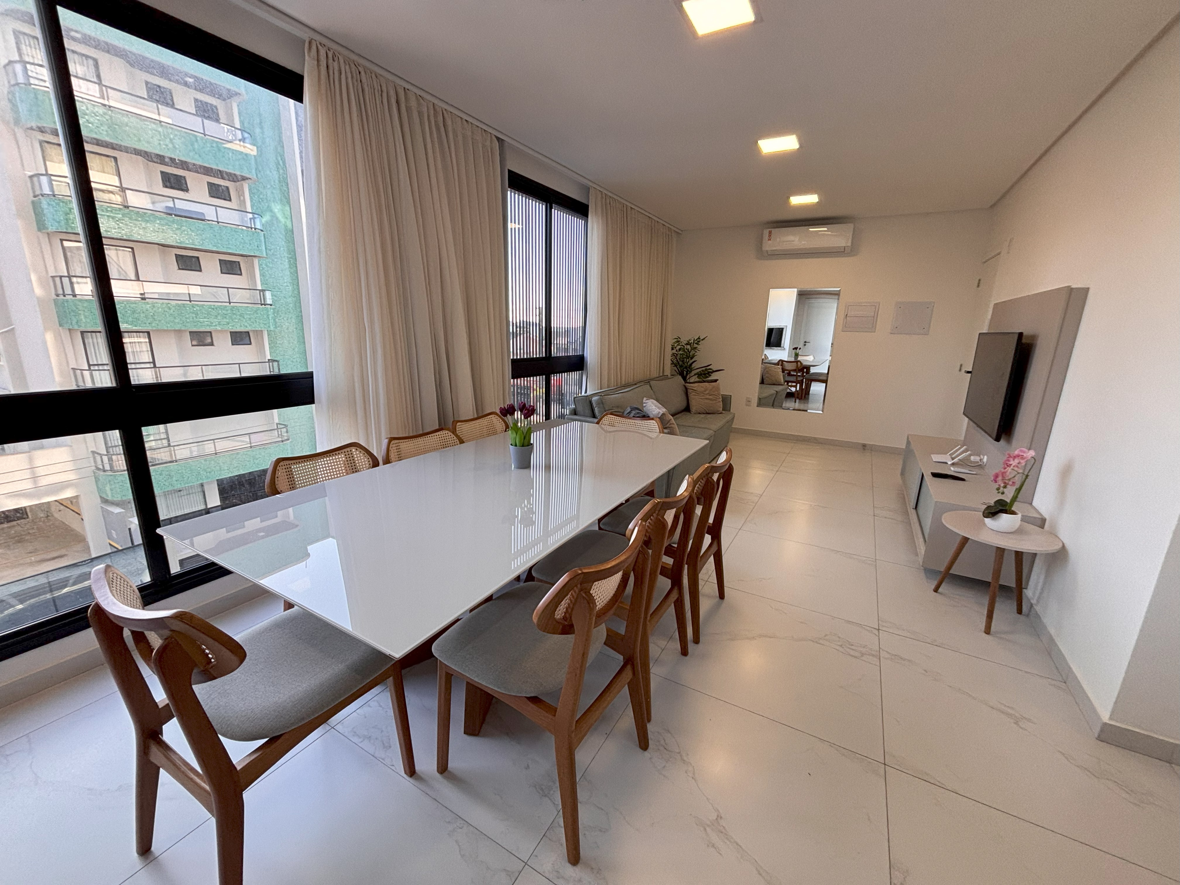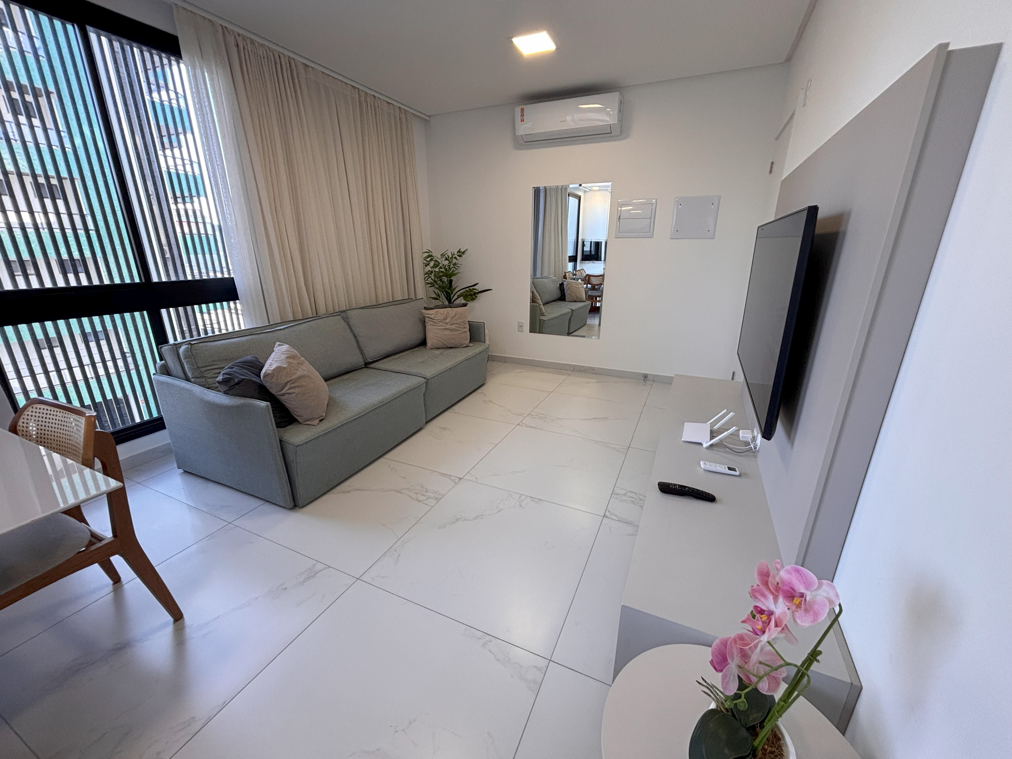 Sala de estar ampla com TV e ar condicionado (Smart TV disponível, com acesso apenas a aplicativos como YouTube e Netflix (não sintoniza canais digitais abertos))
