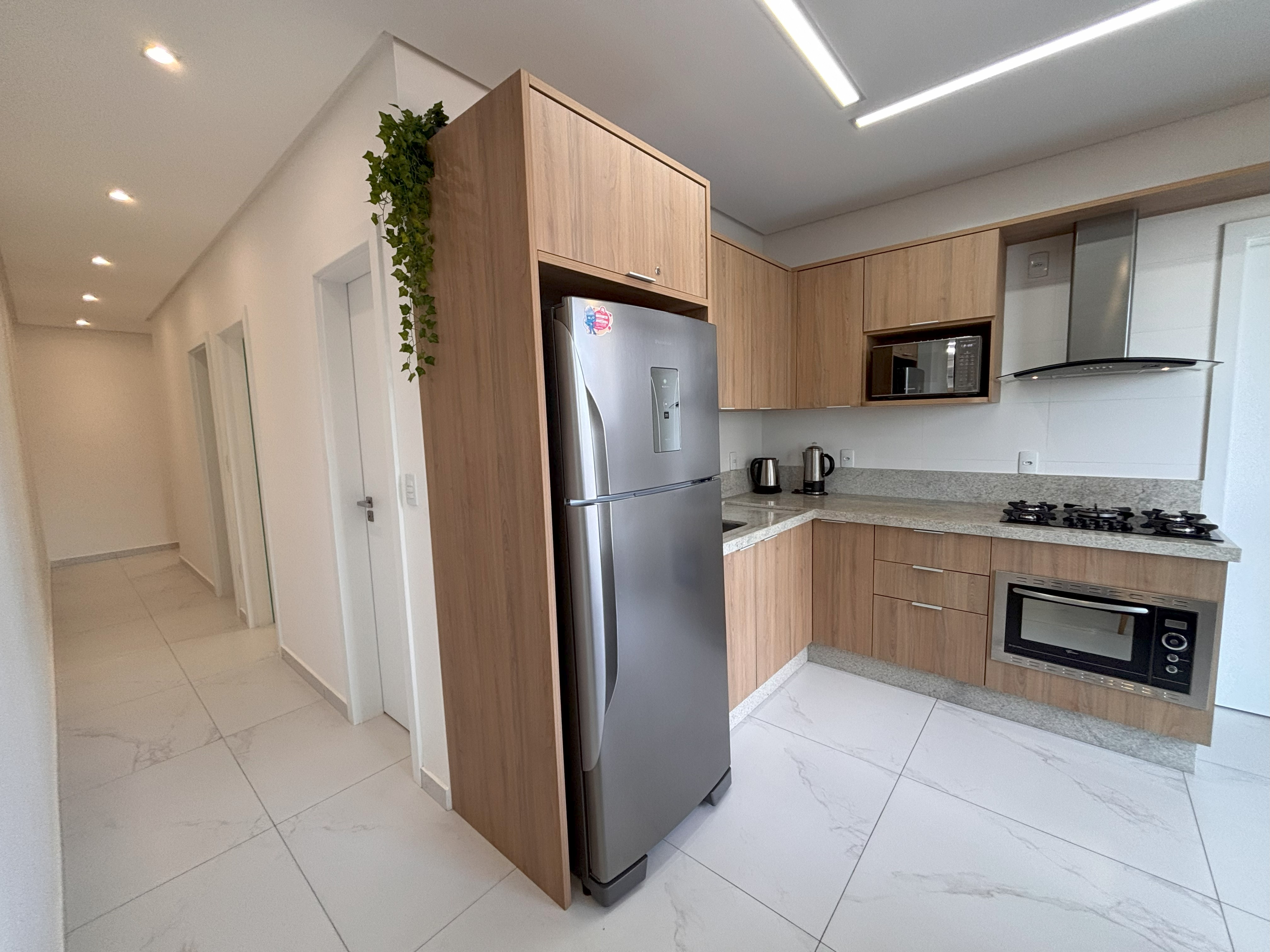 Cozinha completa com churrasqueira, mesa de jantar de 8 lugares, micro-ondas e demais utensílios