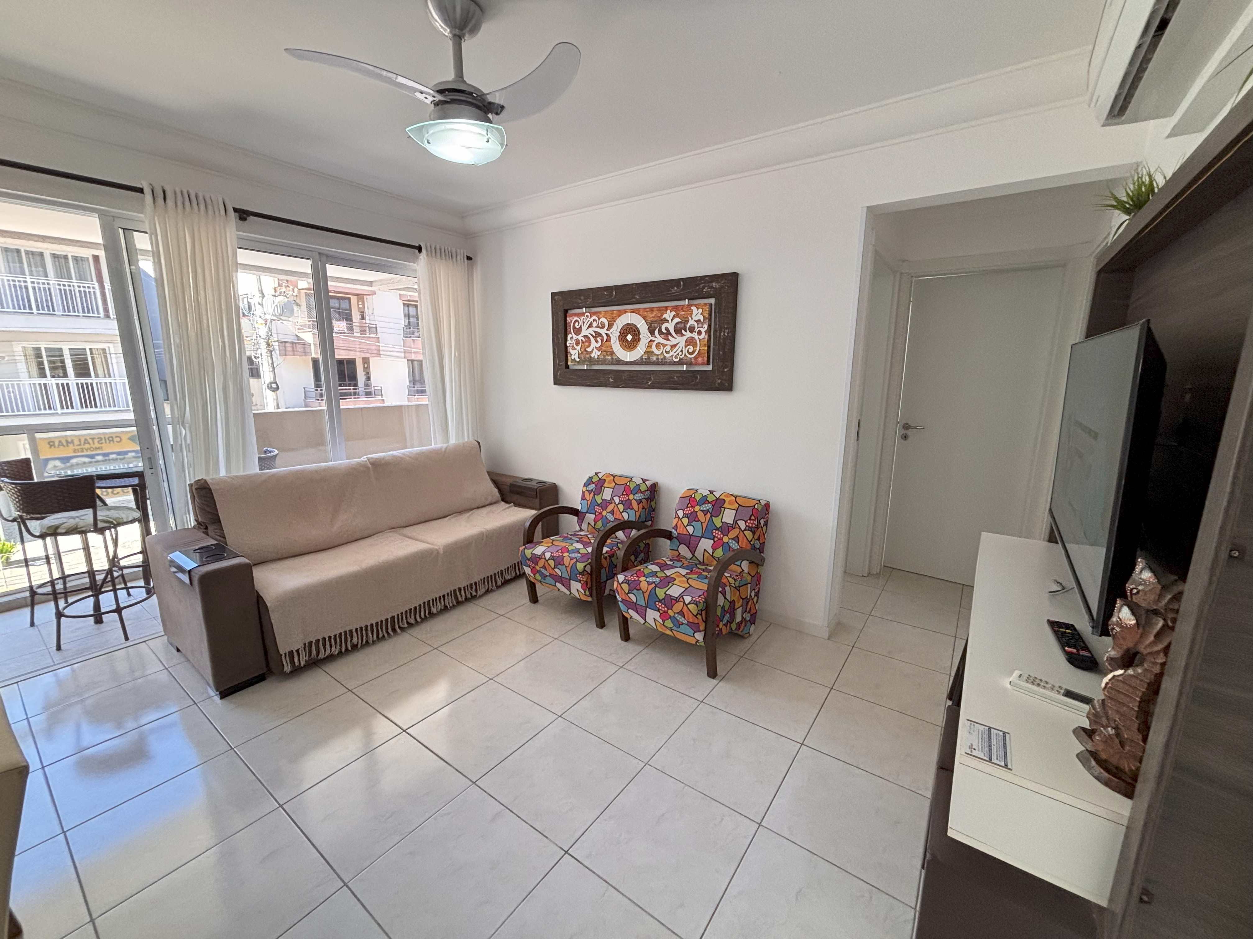 Sala com sofá e TV com parabólica e ar condicionado