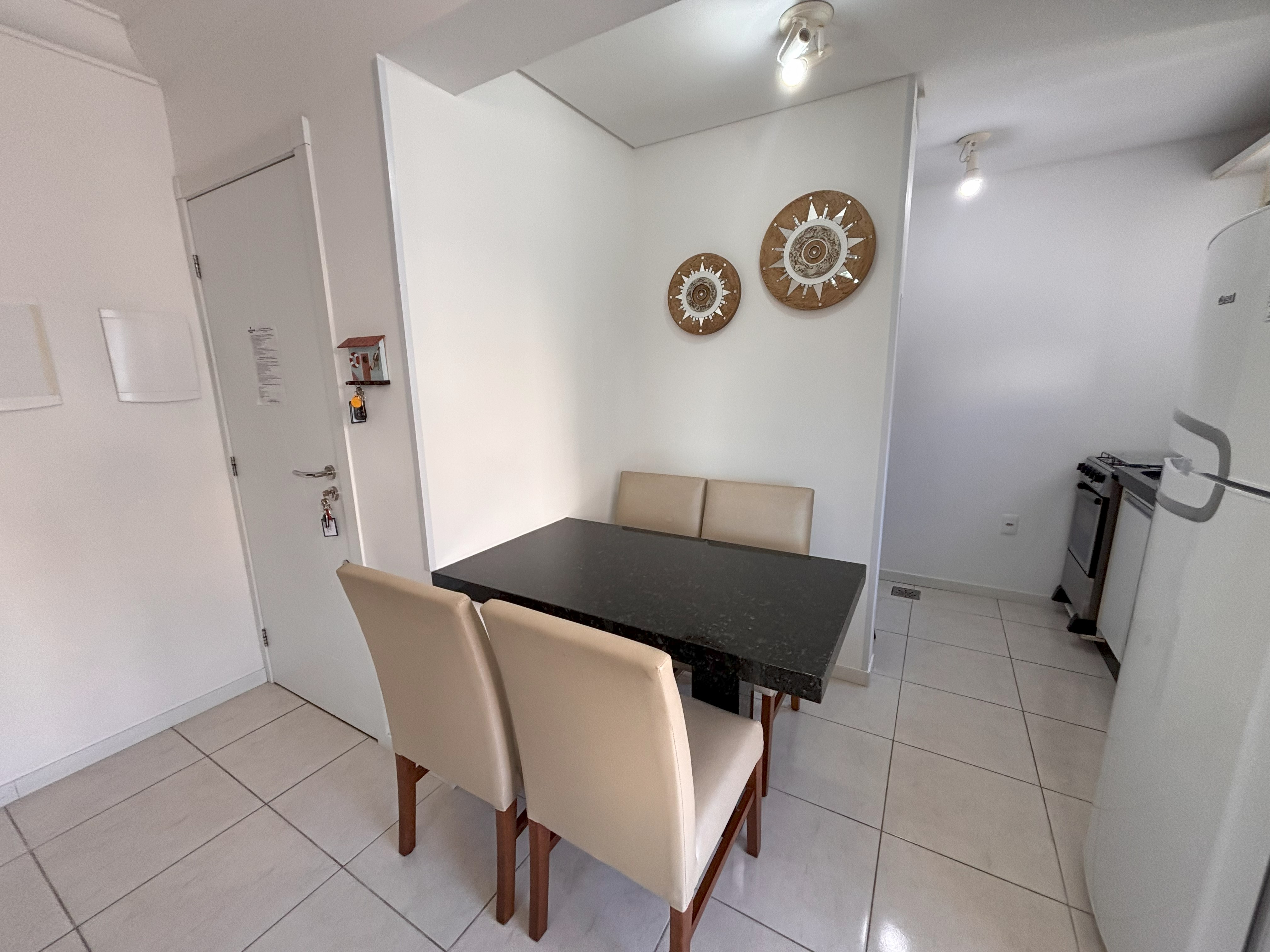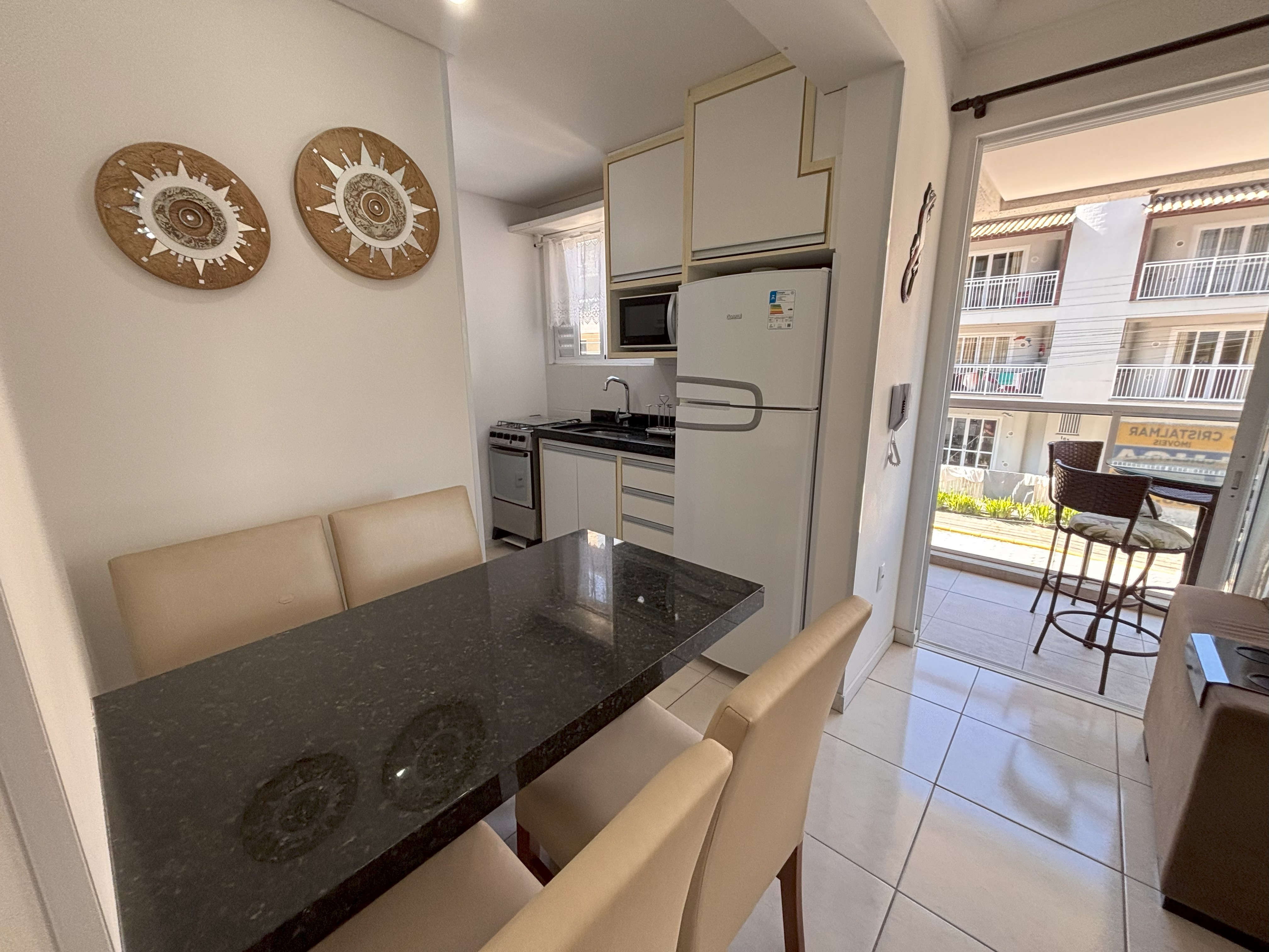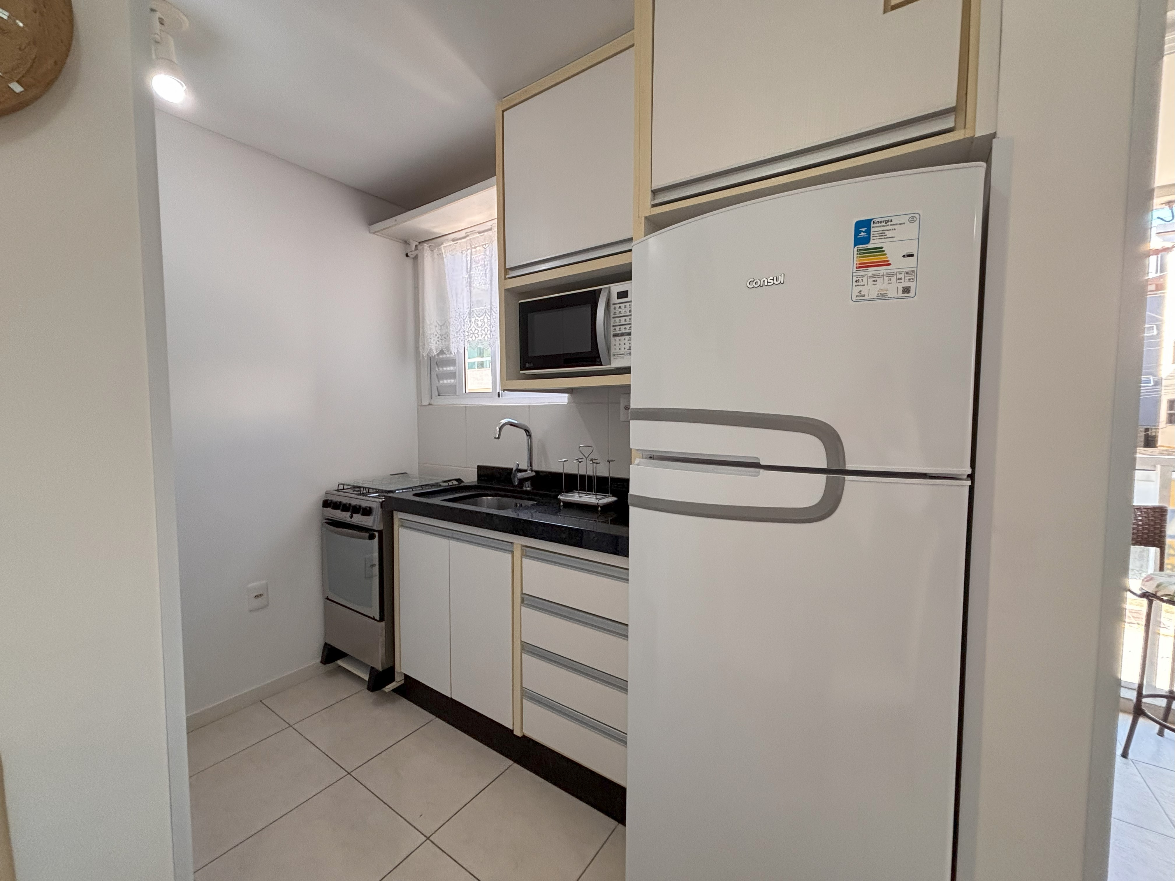 Cozinha com micro-ondas, geladeira, fogão, mesa com 4 cadeiras e demais utensílios básicos