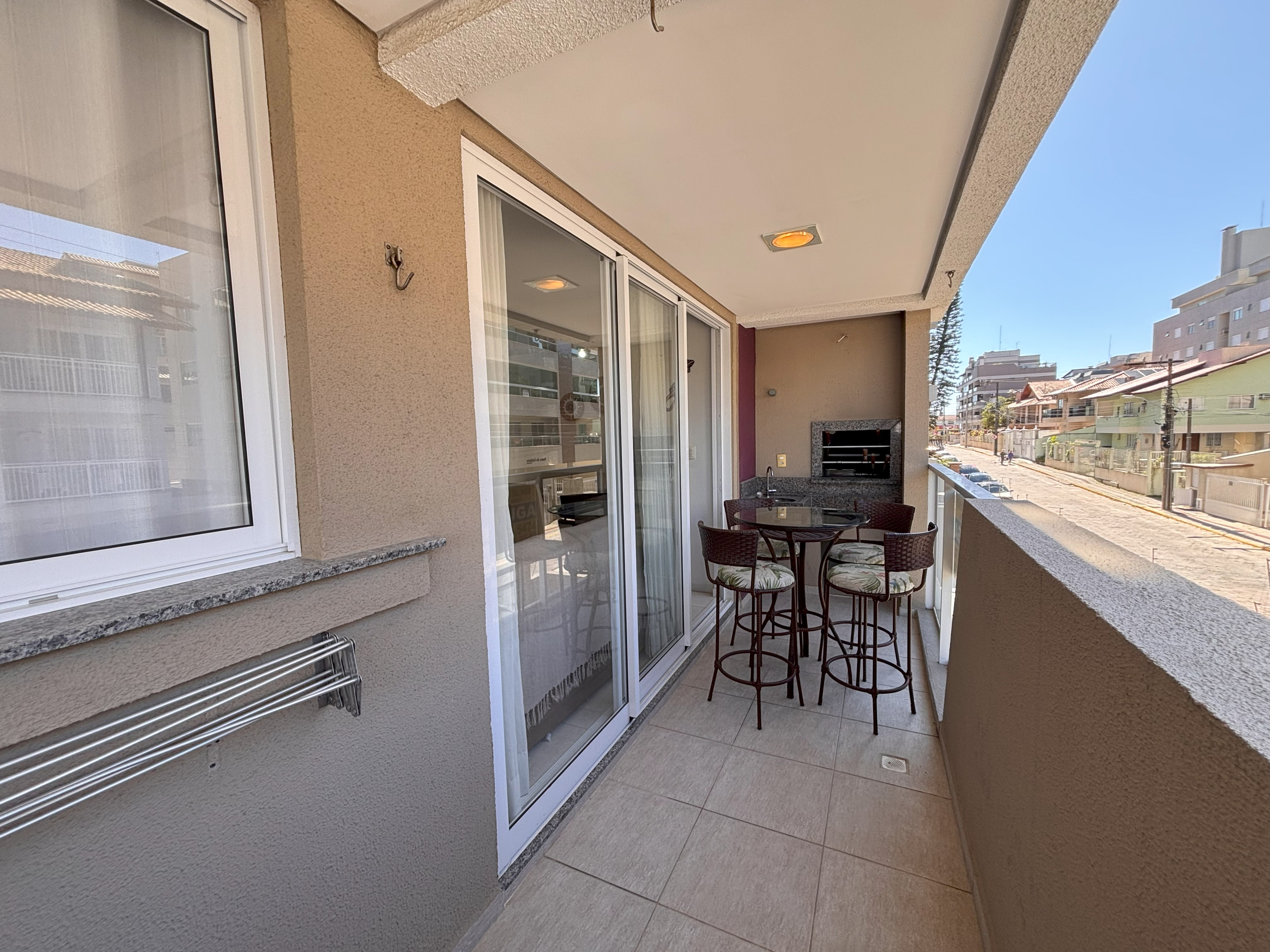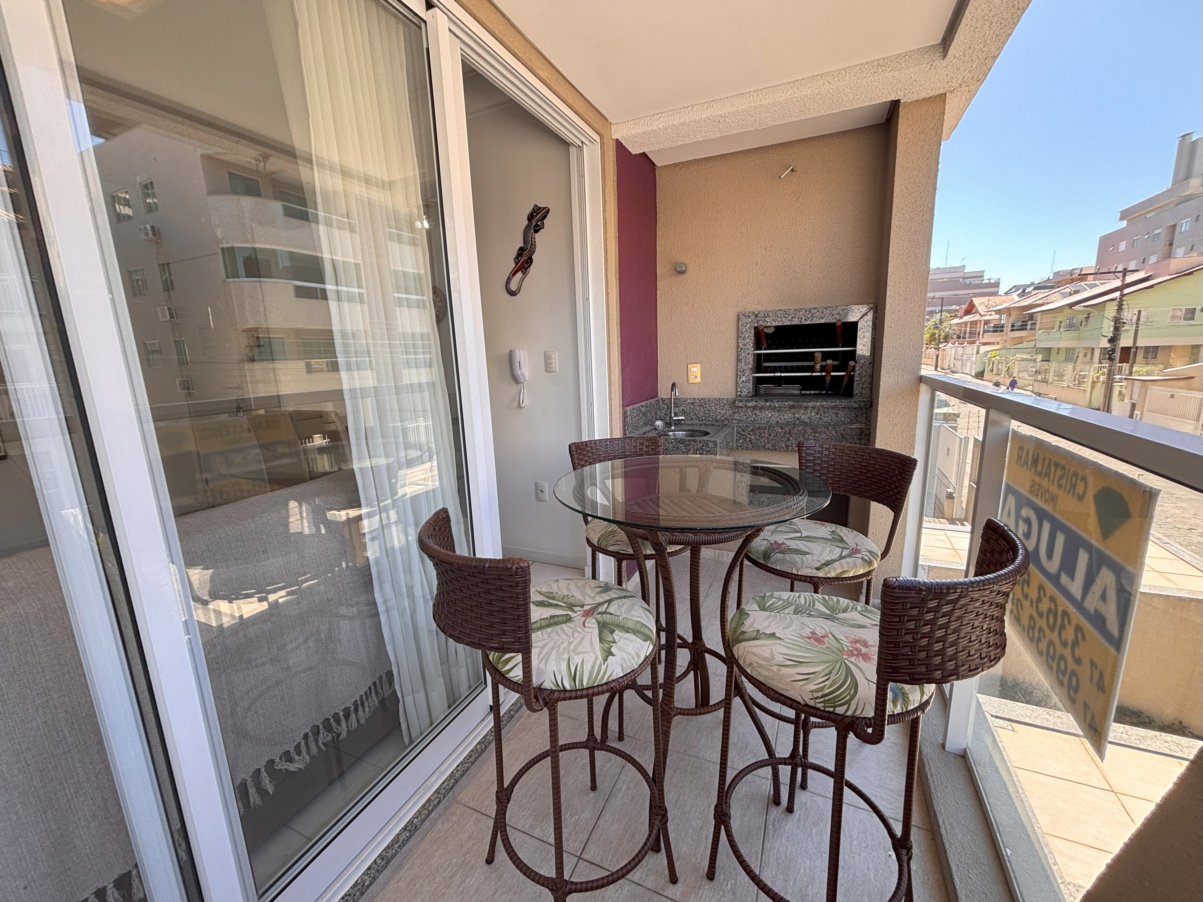 Sacada com Churrasqueira, mesa de vidro com 4 banquetas.