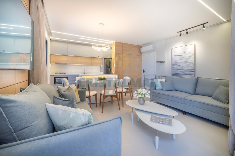 Sala de estar com muita luz natural e vista para o mar. com TV 65 e ar condicionado F/Q;