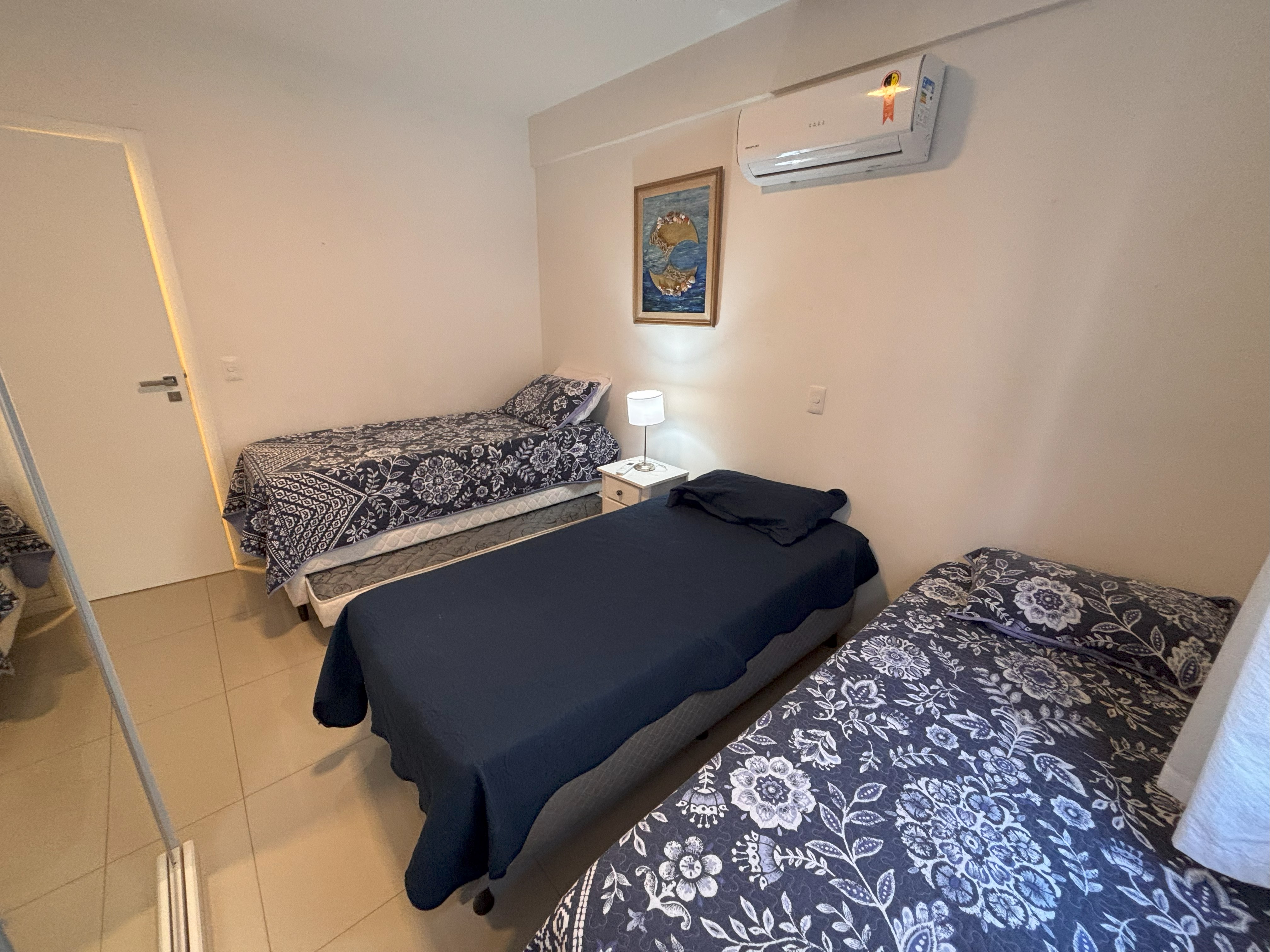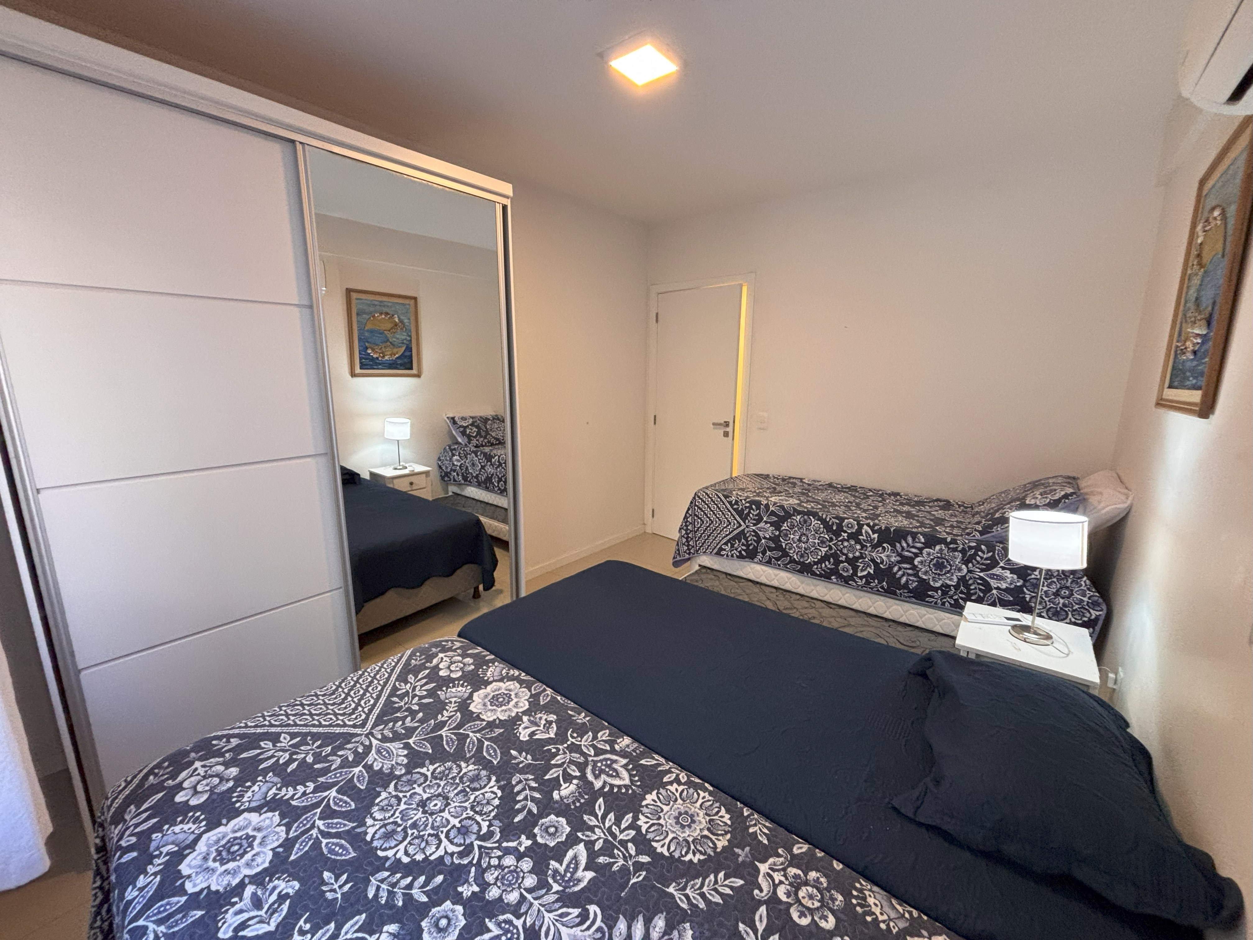 1 dormitório com 3 camas de solteiro + 1 cama auxiliar com 1 colchão para colocar em cima e ar condicionado