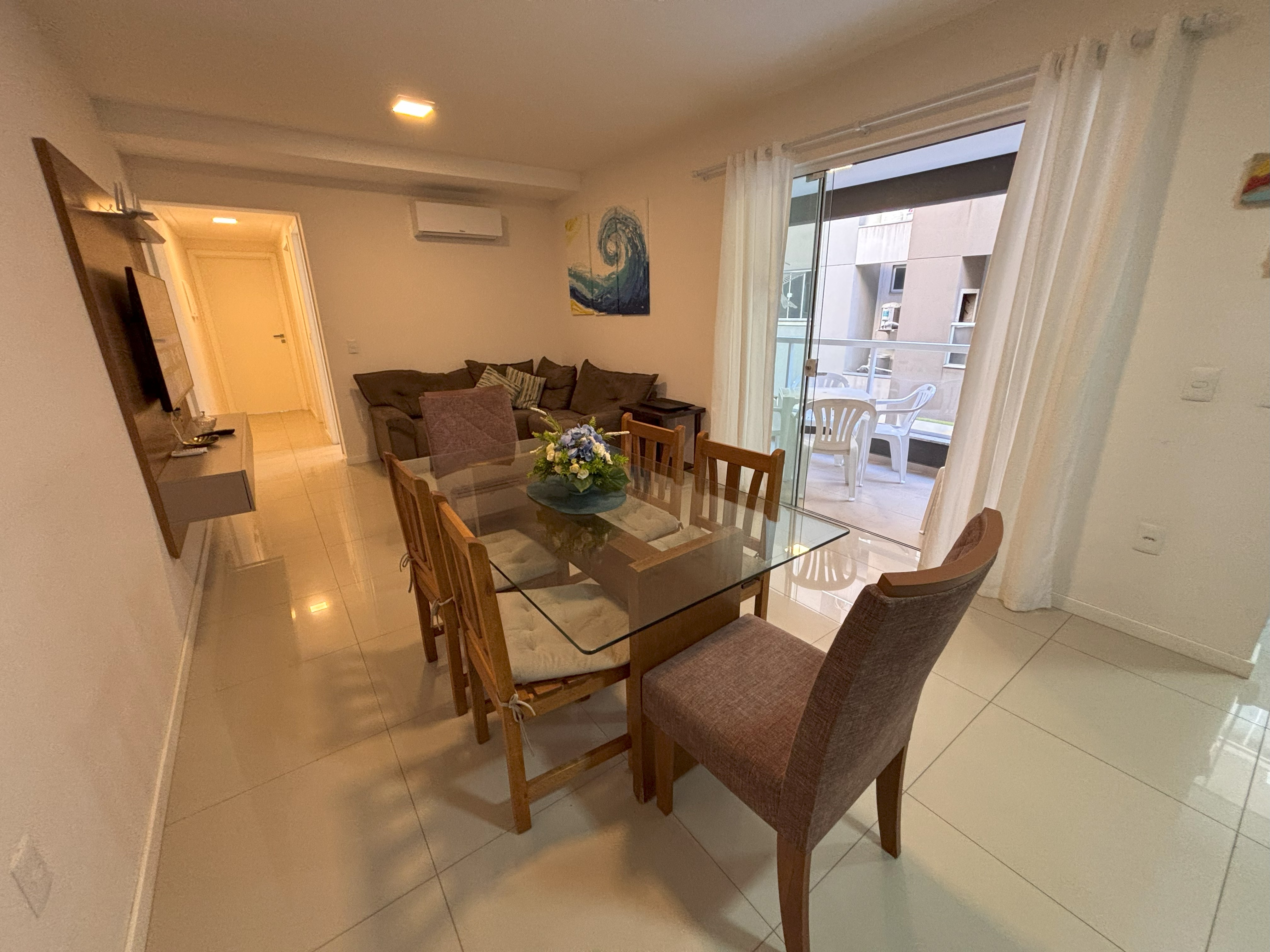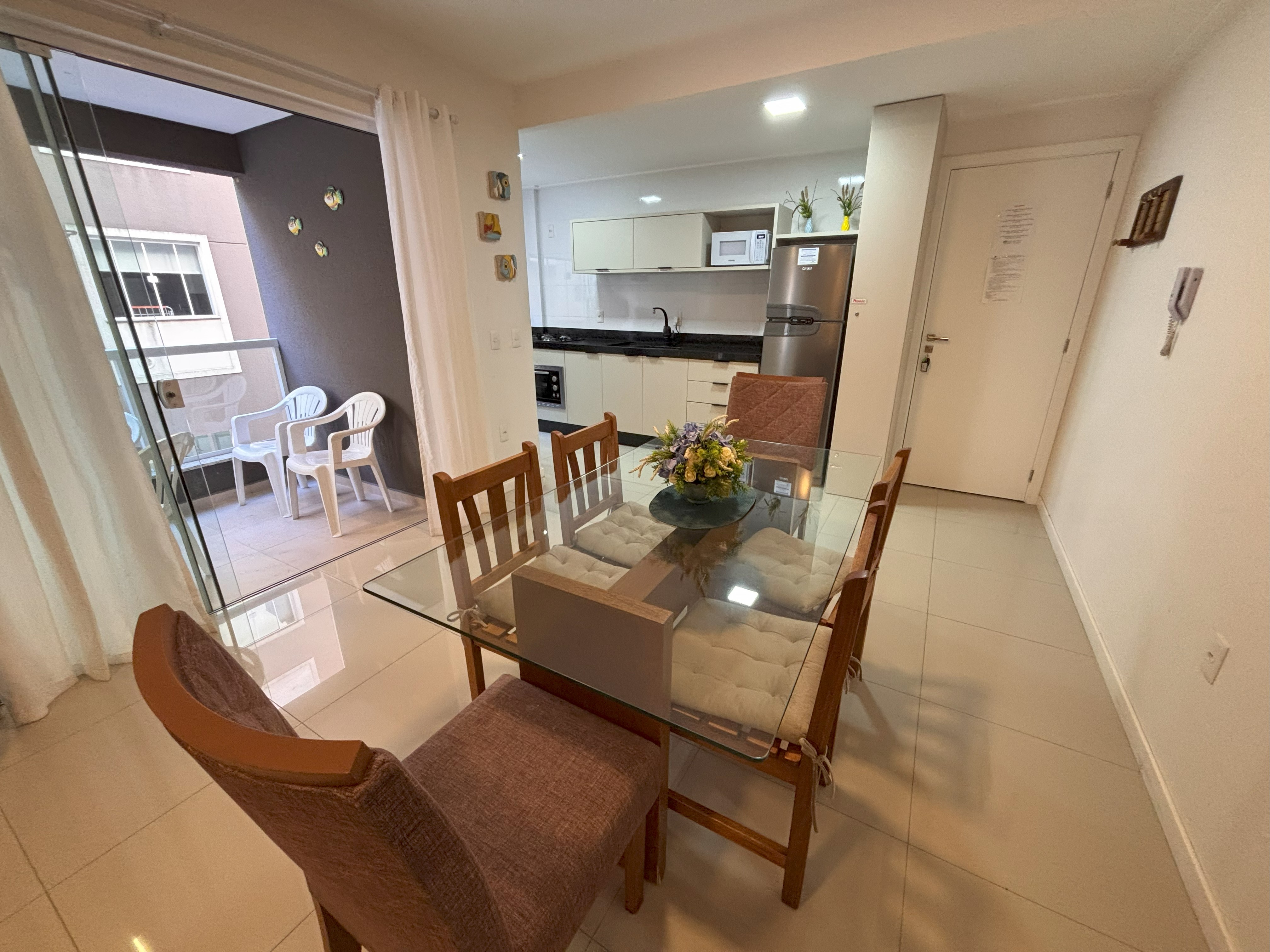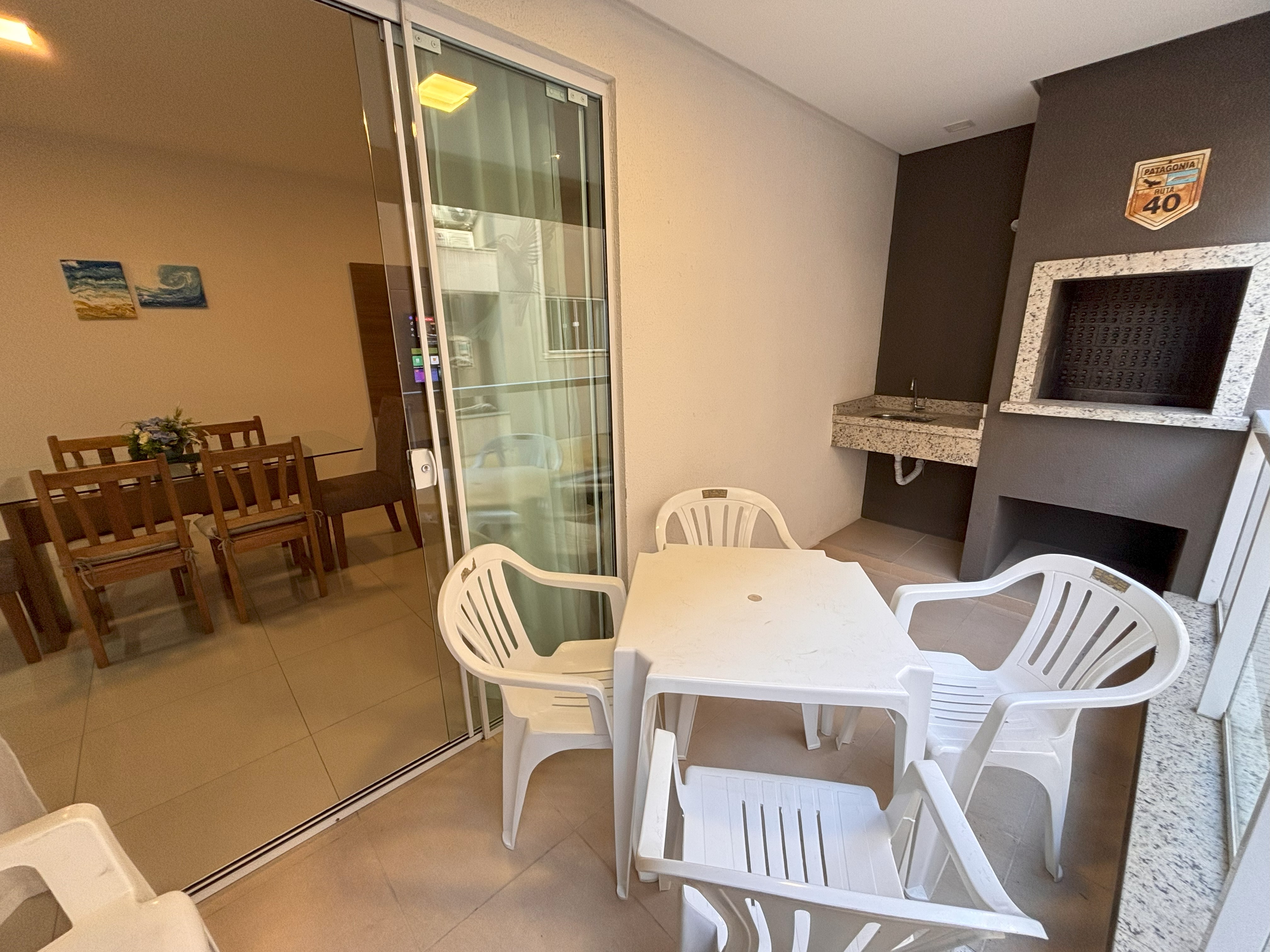 Sacada com churrasqueira mesa plástica com 6 cadeiras